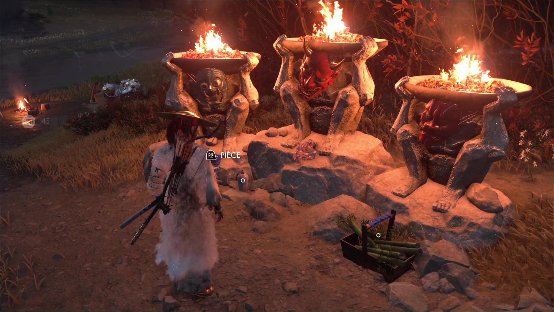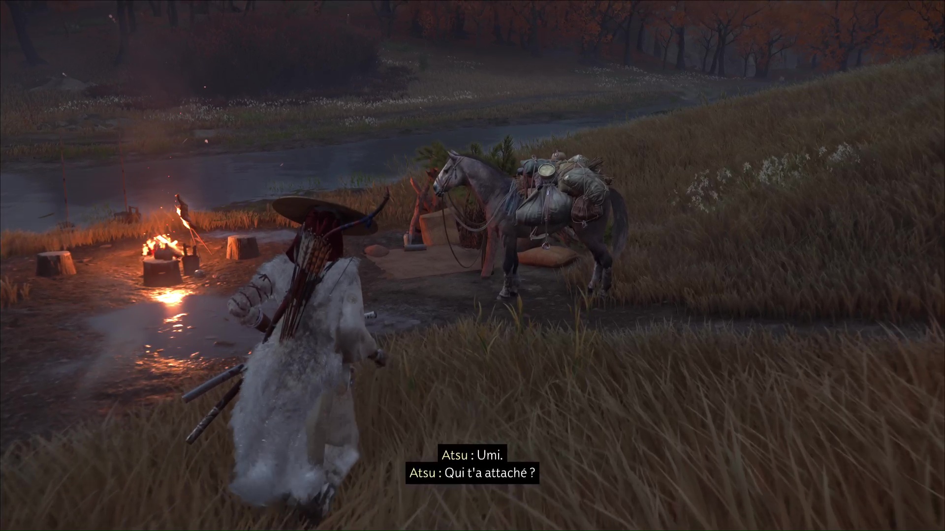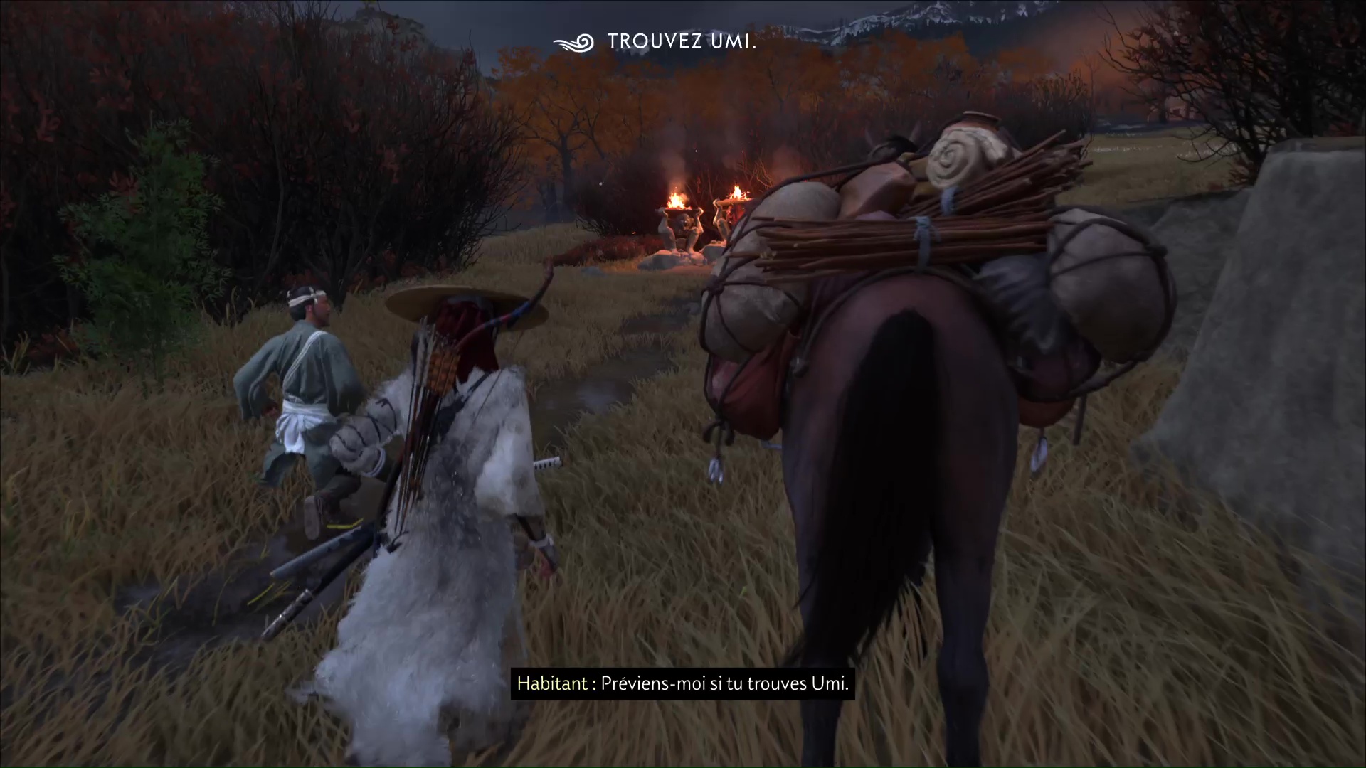Arrivé à destination, le propriétaire des chevaux vous laisse à nouveau vous débrouiller. Profitez-en pour récupérer les offrandes aux statues un peu plus loin et vous apercevrez Umi près de la rivière.