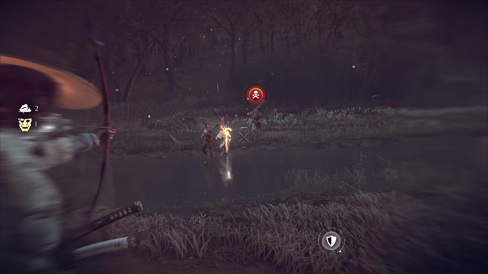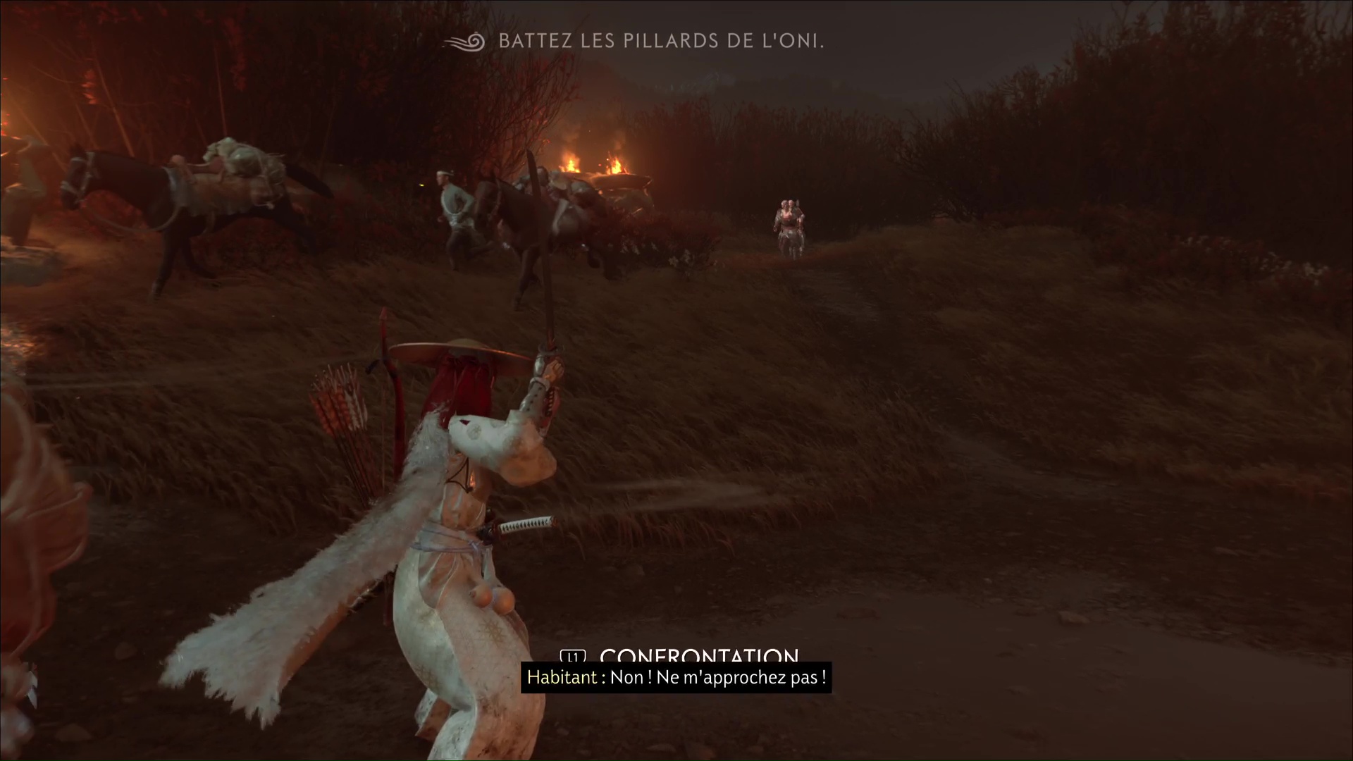 Il est attaché, ce qui signifie que les responsables ne sont pas loin. Détachez-la bête et, en effet, des pillards de l’Oni vont débarquer. Lancez directement une Confrontation pour éliminer un ou deux ennemis gratuitement, puis préparez-vous à vous battre contre les autres.