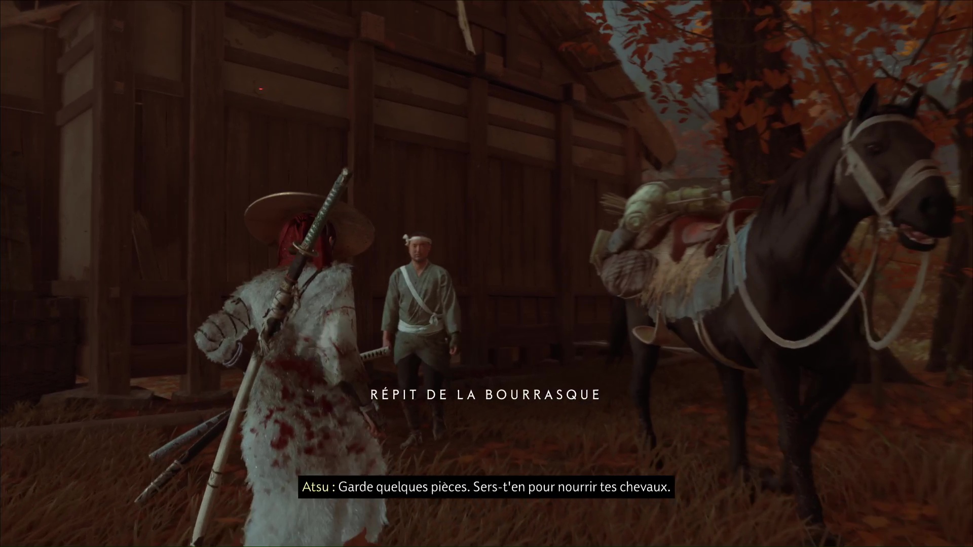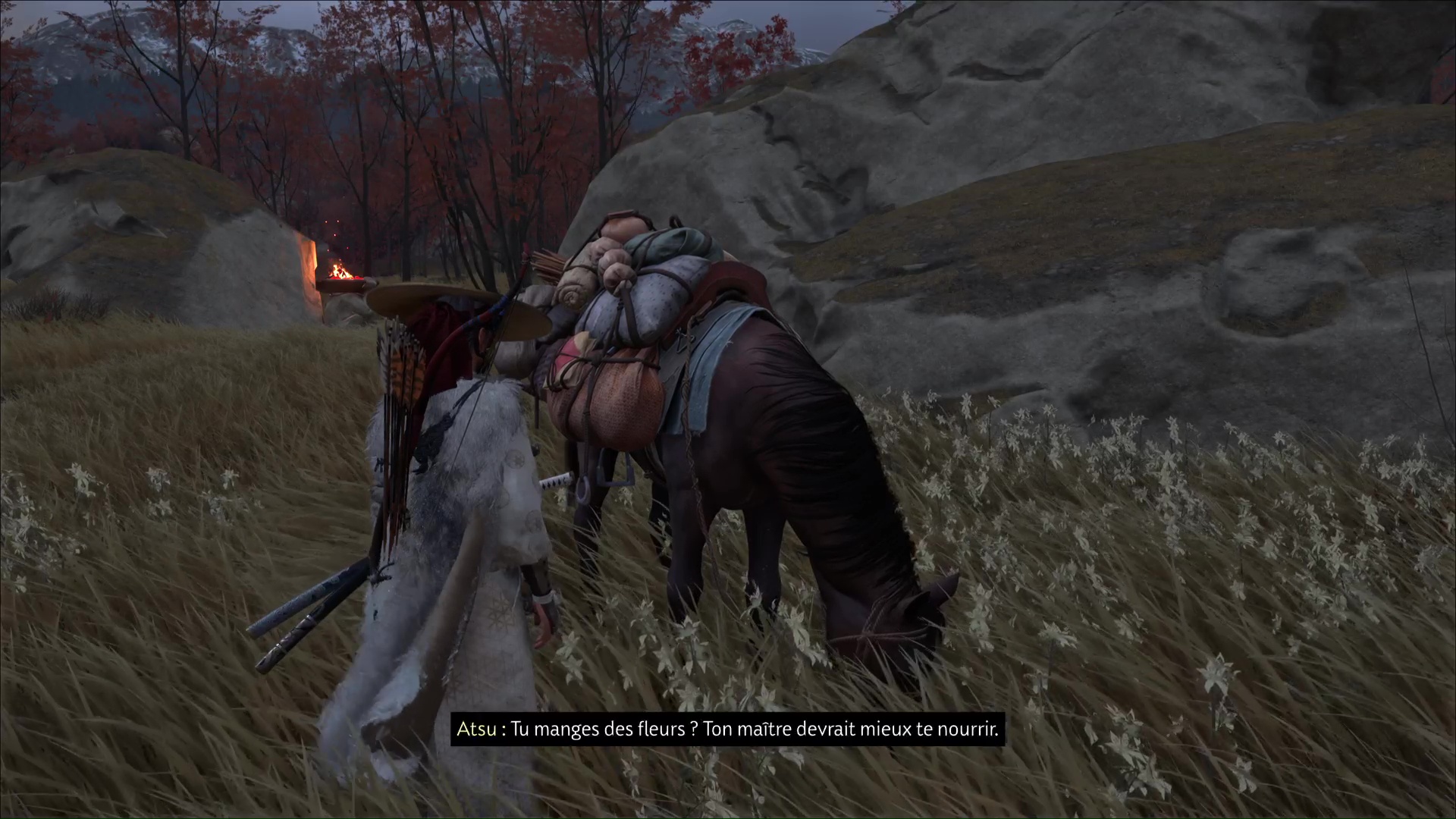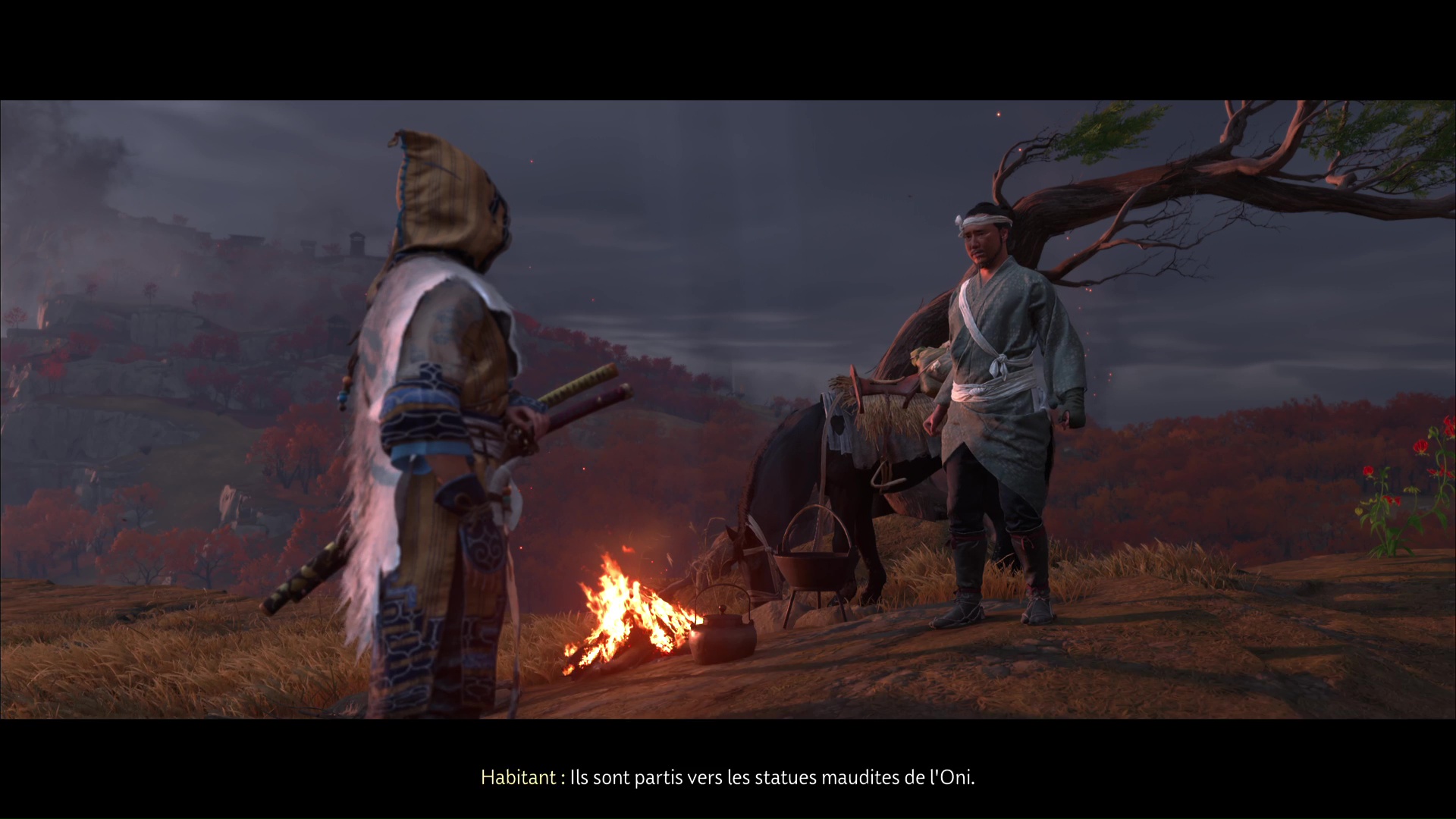 Parlez-lui et il vous fera part de ses problèmes de chevaux. Trois d’entre eux se sont enfuis, et s’il a réussi à en rattraper un, les deux autres continuent de manquer à l’appel. Ils se sont dirigés près de statues maudites de l’Oni, et Atsu va donc mener l’enquête.