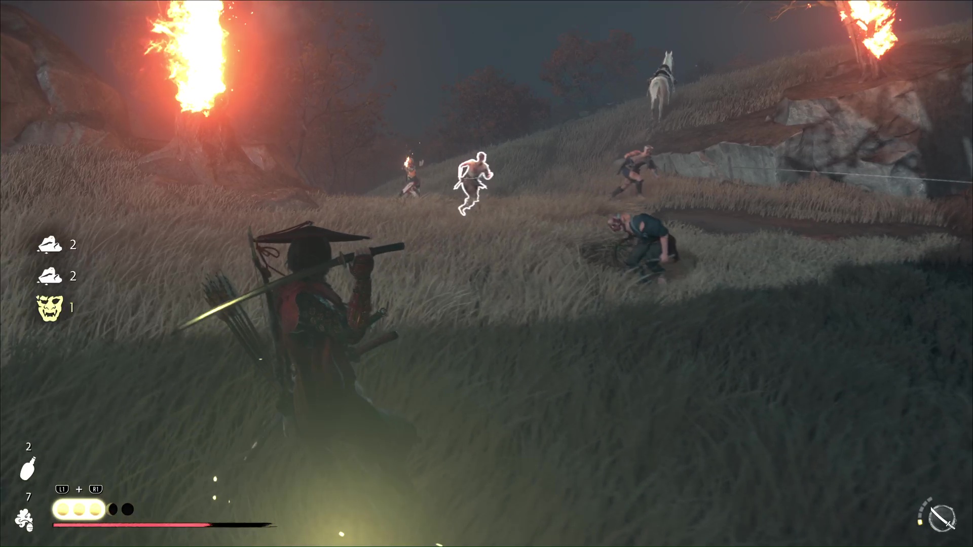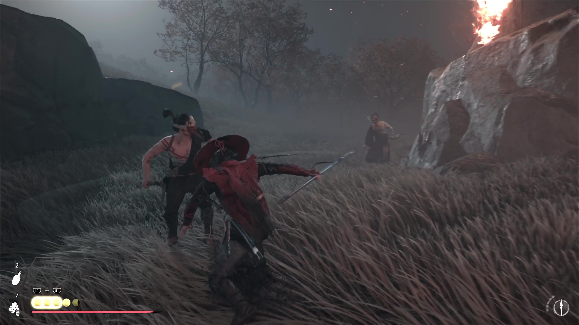 Tuez ensuite les adversaires restants, avant qu’une deuxième vague ne s’approche, constituée notamment d’un archer. Il y a aussi des porteurs de faucilles donc attention au fait qu’ils les enflamment. Notez que le mari saura vous couvrir avec ses flèches.