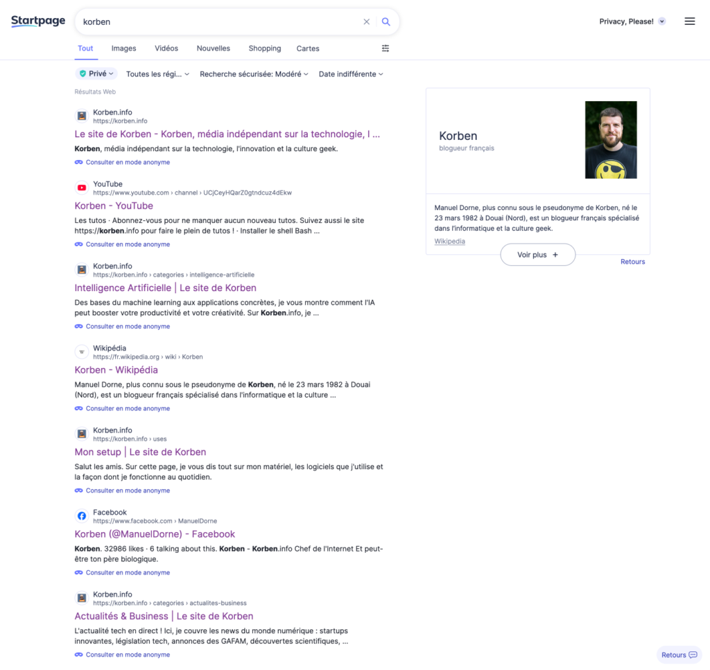 Quand vous tapez une recherche sur Startpage, le moteur va interroger Google à votre place, récupérer les résultats, et vous les afficher. Sauf que votre IP, vos cookies, votre historique… Google n’en voit pas la couleur. C’est comme envoyer quelqu’un faire vos courses pour vous ^^.