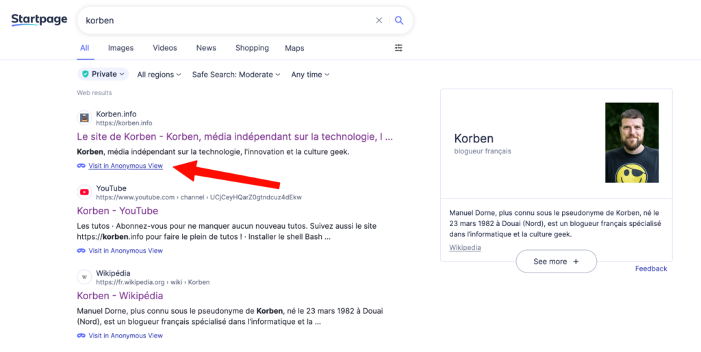 Côté fonctionnalités, y’a un truc que j’adore et que j’utilise quasi systématiquement depuis 3 semaines c’est le mode “Anonymous View“. En fait quand vous cliquez sur un résultat de recherche, au lieu d’aller directement sur le site (qui peut alors tracker votre visite), Startpage peut ouvrir la page via un proxy. Le site que vous visitez ne voit alors que l’IP de Startpage et pas la vôtre. C’est un peu comme un proxy intégré pour chaque clic, qui bloque aussi les scripts de fingerprinting.