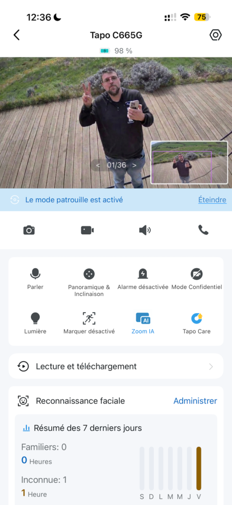 Le mode capture 24/7 est malin. En veille, la caméra enregistre à 1 image par seconde pour économiser la batterie et dès qu’elle détecte quelque chose, elle passe en capture complète. Comme ça on ne rate rien sans exploser l’autonomie. Par contre il faut une carte microSD pour ça (jusqu’à 512 Go) et comme j’en n’ai pas sous la main, j’ai pas pu tester cette fonctionnalité. Faut que j’en achète une !!