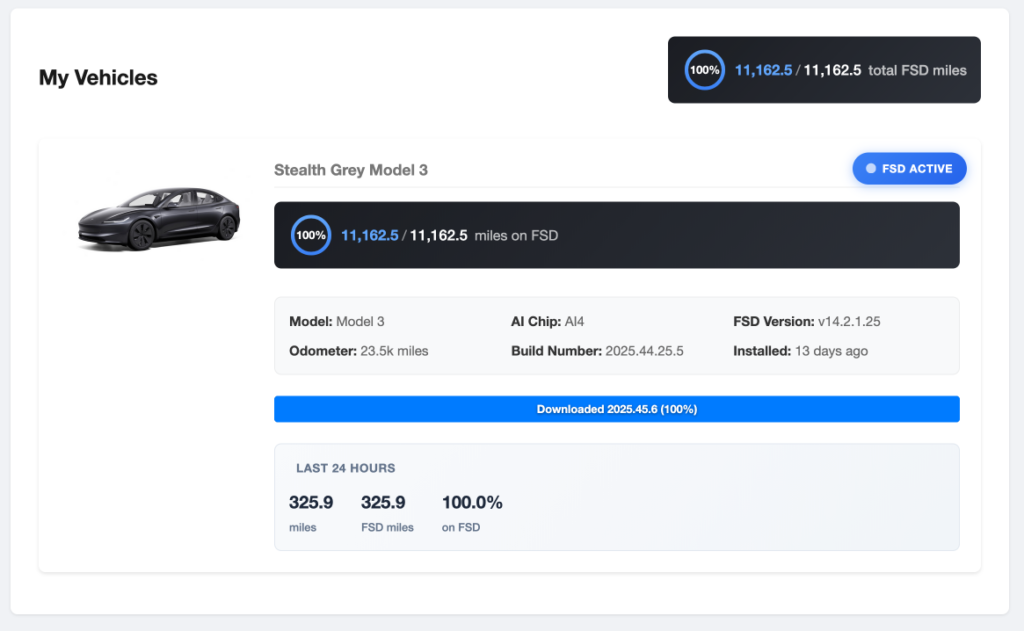 Son véhicule tournait avec la version FSD 14.2.1.25 et la puce AI4, le hardware embarqué actuel sur les Tesla et d’après ses données sur fsddb.com (un site communautaire de tracking FSD), il a même dépassé les 10 000 miles consécutifs sans désengagement.