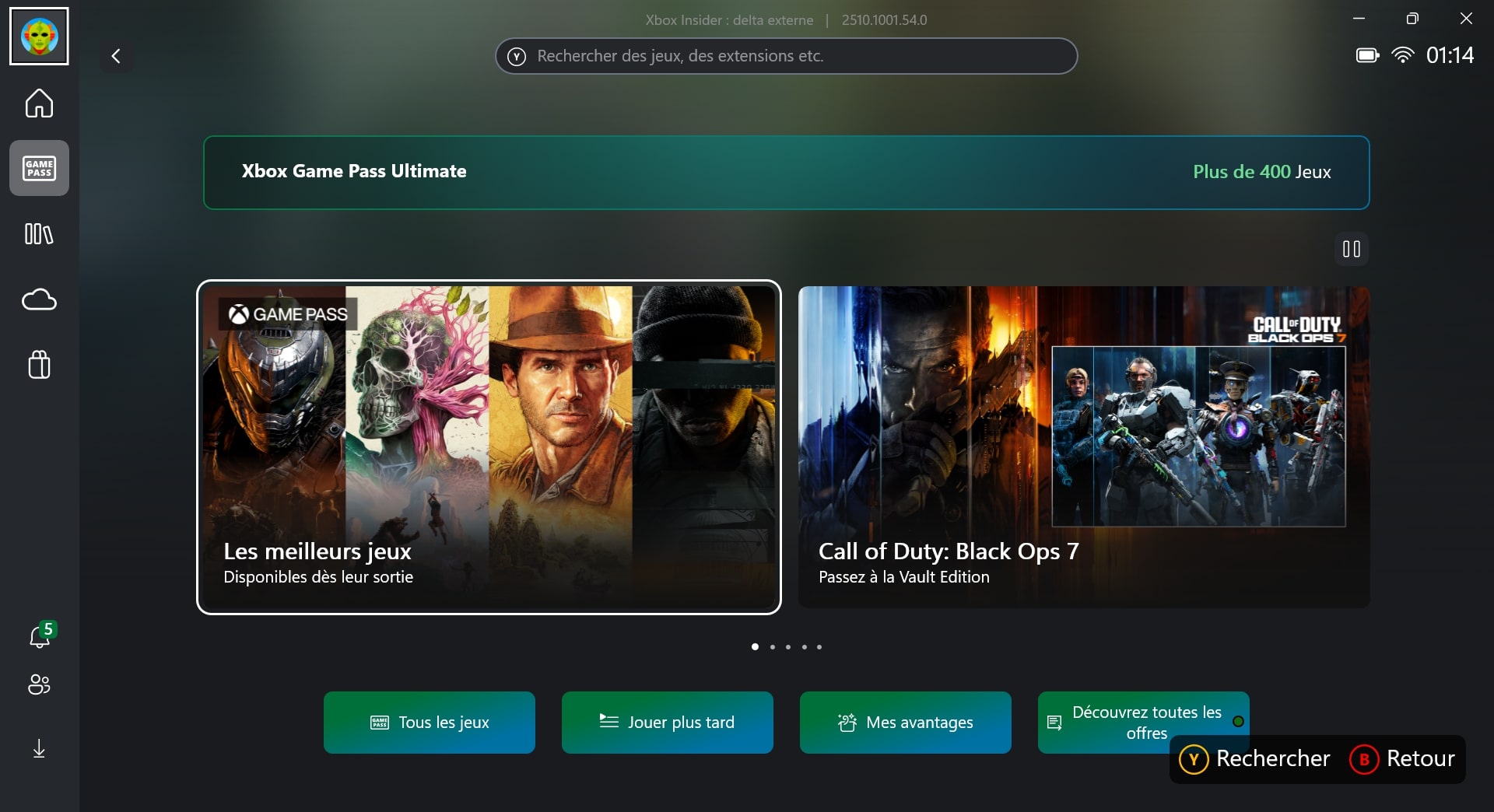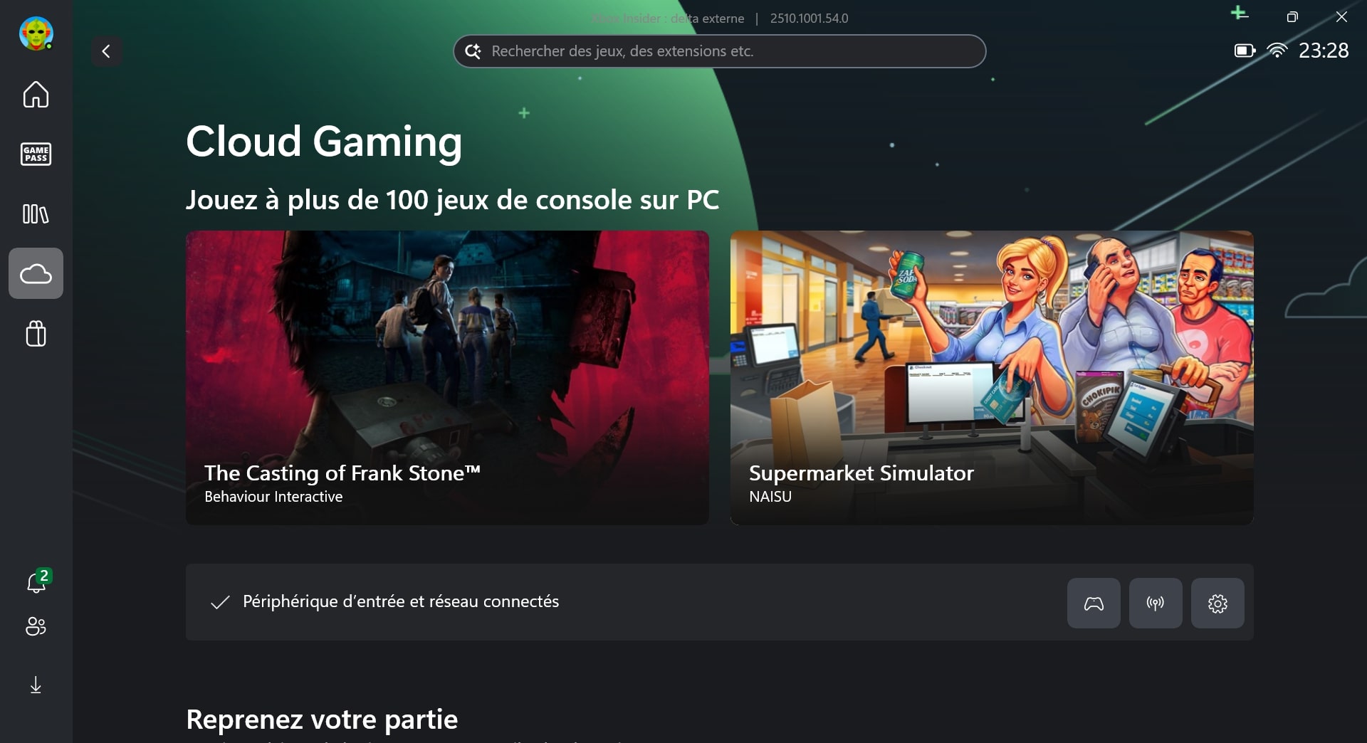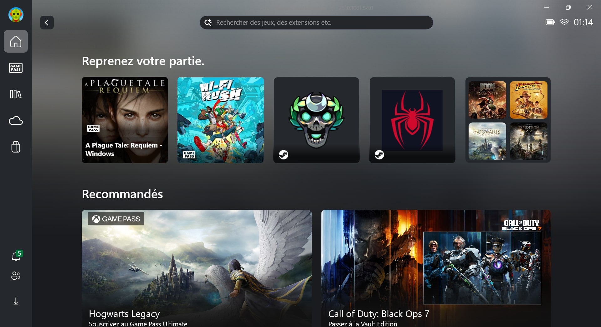 L’occasion de rappeler ici quelque chose d’important et qui a pu provoquer quelques émois ou fake news ces dernières semaines : oui, il vous est évidemment possible de lancer des jeux natifs PC sur l’Asus ROG Xbox Ally X… mais uniquement à partir du moment où vous possédez la version PC du jeu, quelle que soit la boutique. Si vous ne possédez qu’une version Xbox pour un jeu qui ne fait pas partie du programme Xbox Play Anywhere (et il y en a encore des gros noms comme The Witcher 3: Wild Hunt, Elden Ring ou encore Cyberpunk 2077), vous ne pourrez les lancer… qu’avec le Xbox Cloud Gaming. Nous avons d’ailleurs pu utiliser ce dernier sans heurts sur DOOM: The Dark Ages pendant au moins deux heures, après quelques jours de lenteurs dues au déploiement de la fonctionnalité sur les appareils de test.