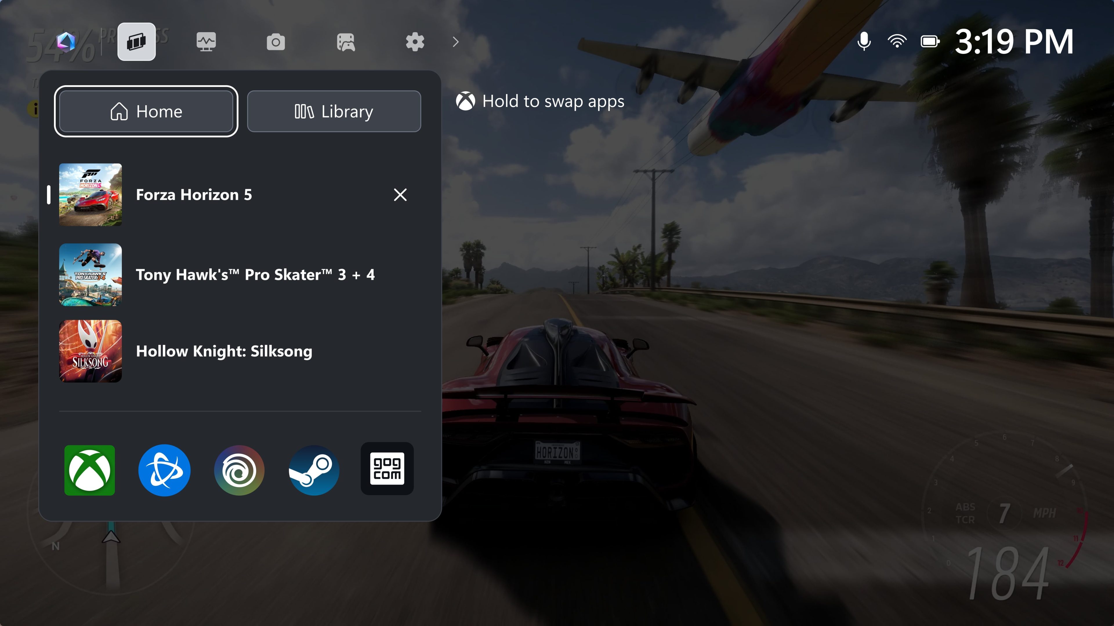 On retrouvera aussi l’Assistant de jeu Copilot Gaming (en cours de déploiement), l’accès aux Captures (visionnage et création), à vos Succès ou votre espace Social Xbox, etc. tandis qu’en restant appuyé dessus, vous pourrez basculer d’une fenêtre ouverte à l’autre ou ouvrir un nouveau bureau comme sur un PC. L’avantage étant que si vous tentez de lancer un jeu alors qu’un autre est déjà ouvert, le console vous proposera de le fermer avant. On aurait aimé davantage de personnalisation possible avec ce bouton censé révolutionner l’usage des consoles Asus ROG Ally, mais il s’agit finalement d’un bouton de raccourcis bien fichu.
