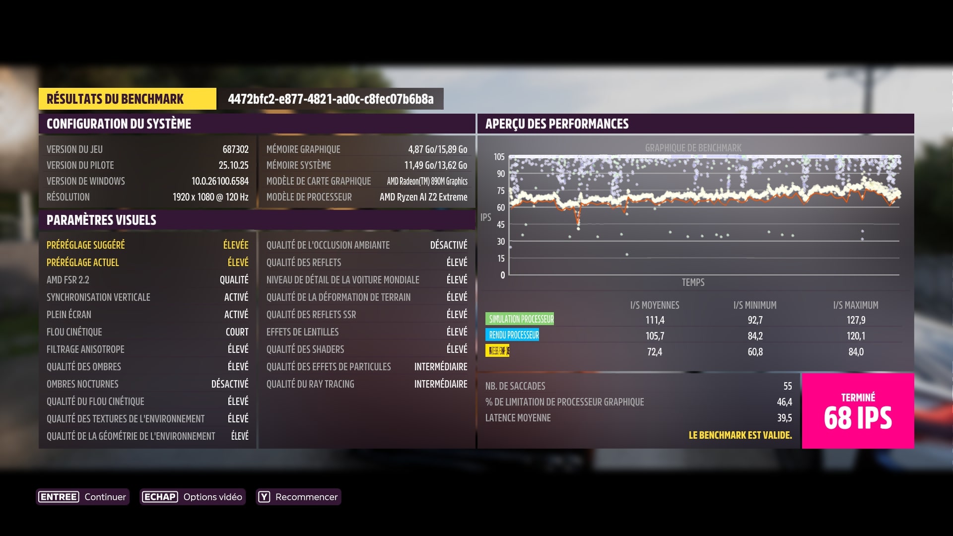 En clair, si vous souhaitez du 60 fps constant sur ce genre de jeux sans utiliser de FSR ou autre type d’IA, il vous faudra assurément rogner sur la résolution ou les paramètres graphiques. Sur un écran de cette taille, ce n’est vraiment pas très grave, mais il est vrai qu’autrement, les sessions pouvaient rapidement devenir douloureuses. Les techniques d’upscaling sont donc vraiment primordiales pour bénéficier d’expériences adaptées sur ces Asus ROG Xbox Ally X et vous permettront de réellement changer votre expérience, y compris en consommant moins de batterie dans des modes plus économes.