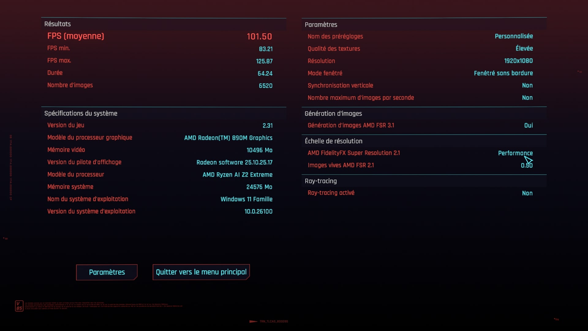 Cyberpunk 2077 a été un peu notre mètre étalon durant ces tests, avec des résultats allant du bluffant au très décevant. Il s’agissait d’ailleurs de l’un des jeux que nous avons testés possédant la fonctionnalité de Benchmark, permettant de caler les paramètres de jeu sur ceux de votre bécane, et ainsi d’optimiser au maximum. En mode Turbo 35 W (branché), ce résultat nous a fourni une moyenne de fps de 101,5 avec des paramètres graphiques personnalisés (textures élevées, tout le reste en moyen, faible densité de foule, sans flou cinétique, pas de limitation des fps, pas de Ray-Tracing et l’utilisation du FSR 3.1 avec mise à l’échelle en mode Performance utilisant l’AMD FidelityFX Super Resolution 2.1).