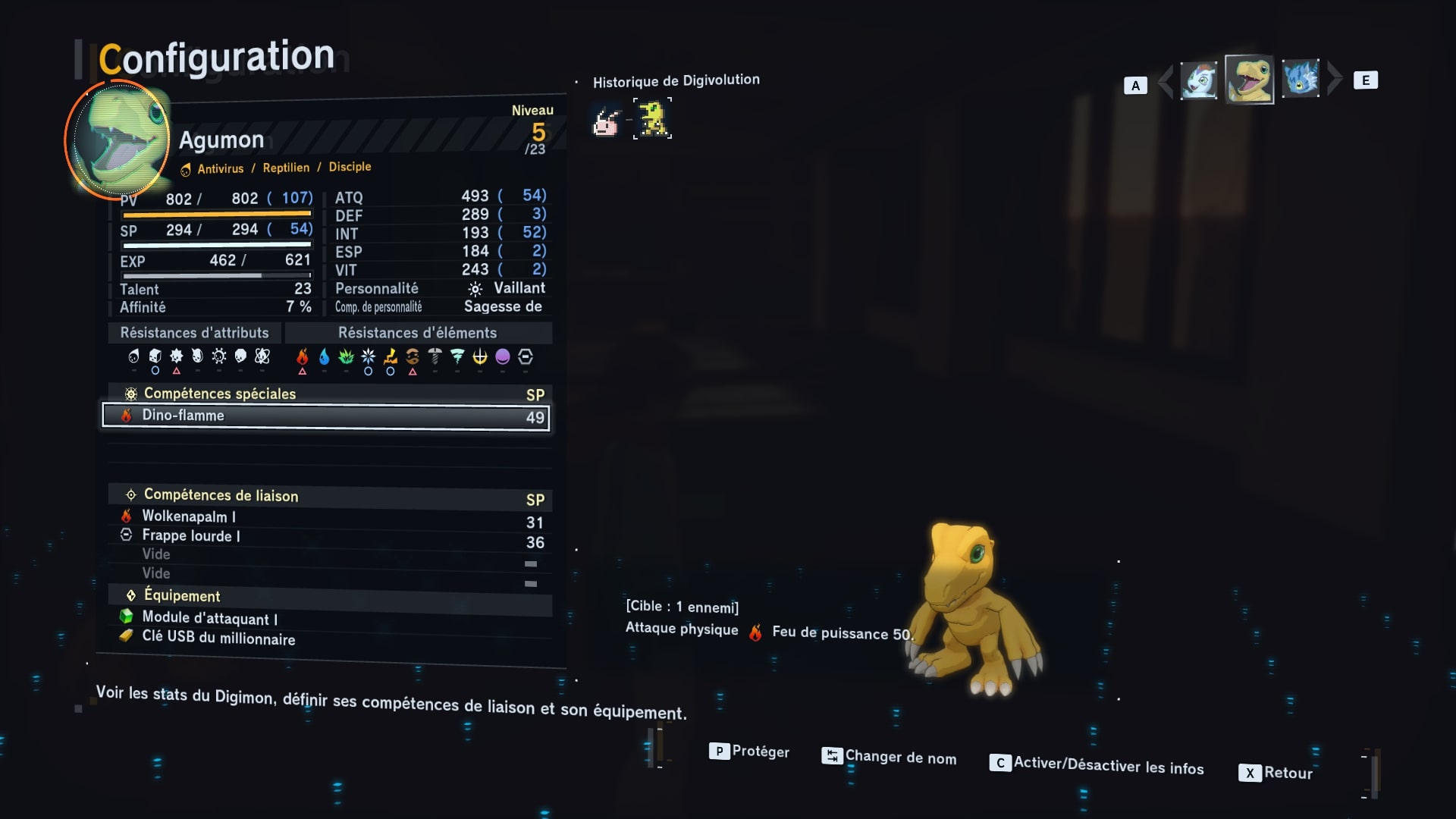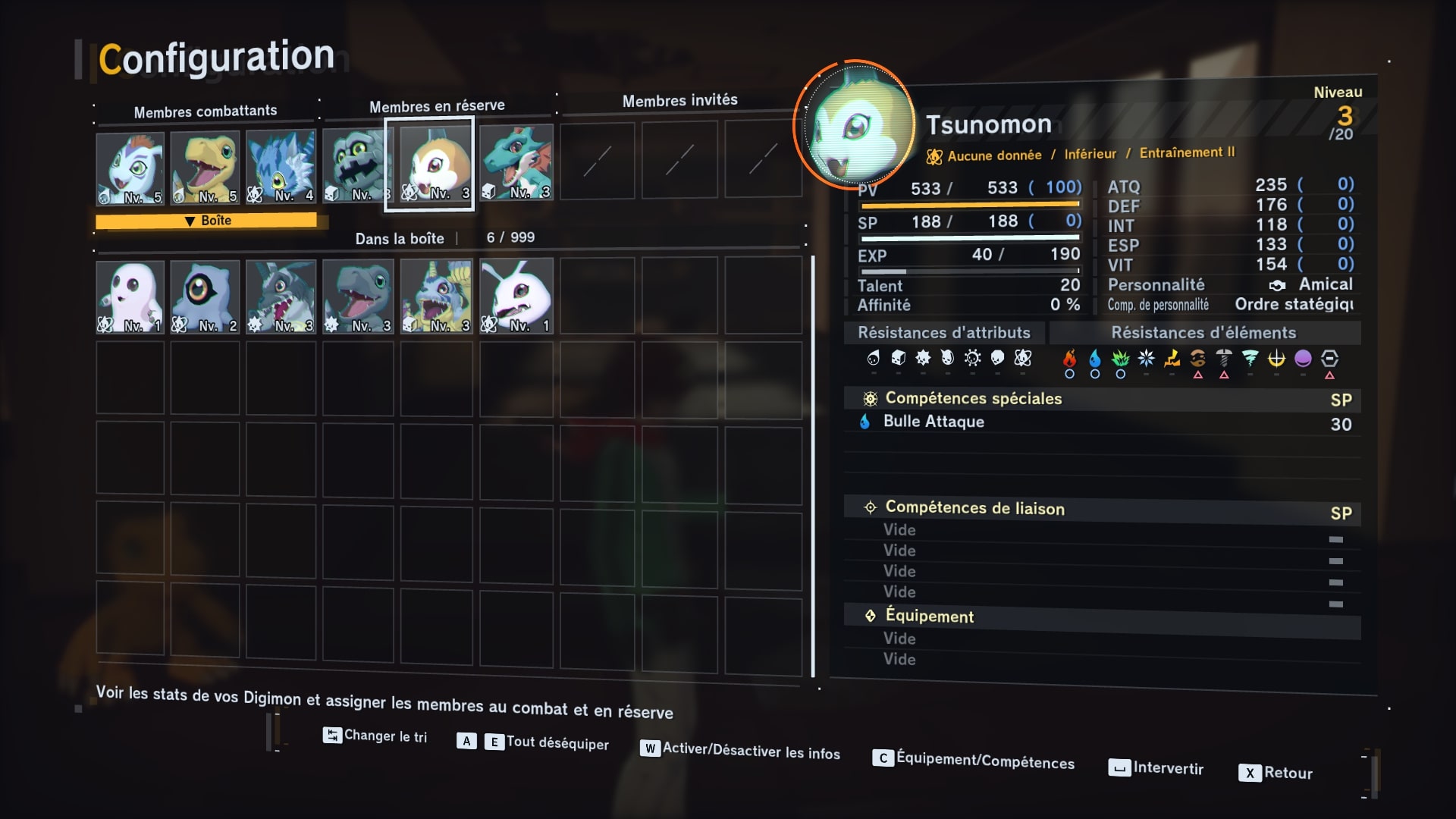 Susceptibles de changer tout au long de notre périple, chacun d’eux est donc doté d’un niveau d’XP, un Attribut (Données, Virus, Antivirus…), un Trait de personnalité (Zélé, Stratégique, Tolérant…), des Éléments auxquels il est plus vulnérable ou résistant qu’à d’autres (Feu, Eau, Vent…), un pourcentage d’Affinité, un rang de Talent (plus il est élevé, plus le niveau d’XP maximum augmente), des statistiques qui déterminent son efficacité pendant un affrontement (Attaque, Défense, Vitesse…), des Compétences spéciales ou de Liaison, qui sont uniques ou à lui attribuer manuellement parmi toutes celles que nous avons en stock, et deux slots d’objets à lui équiper.