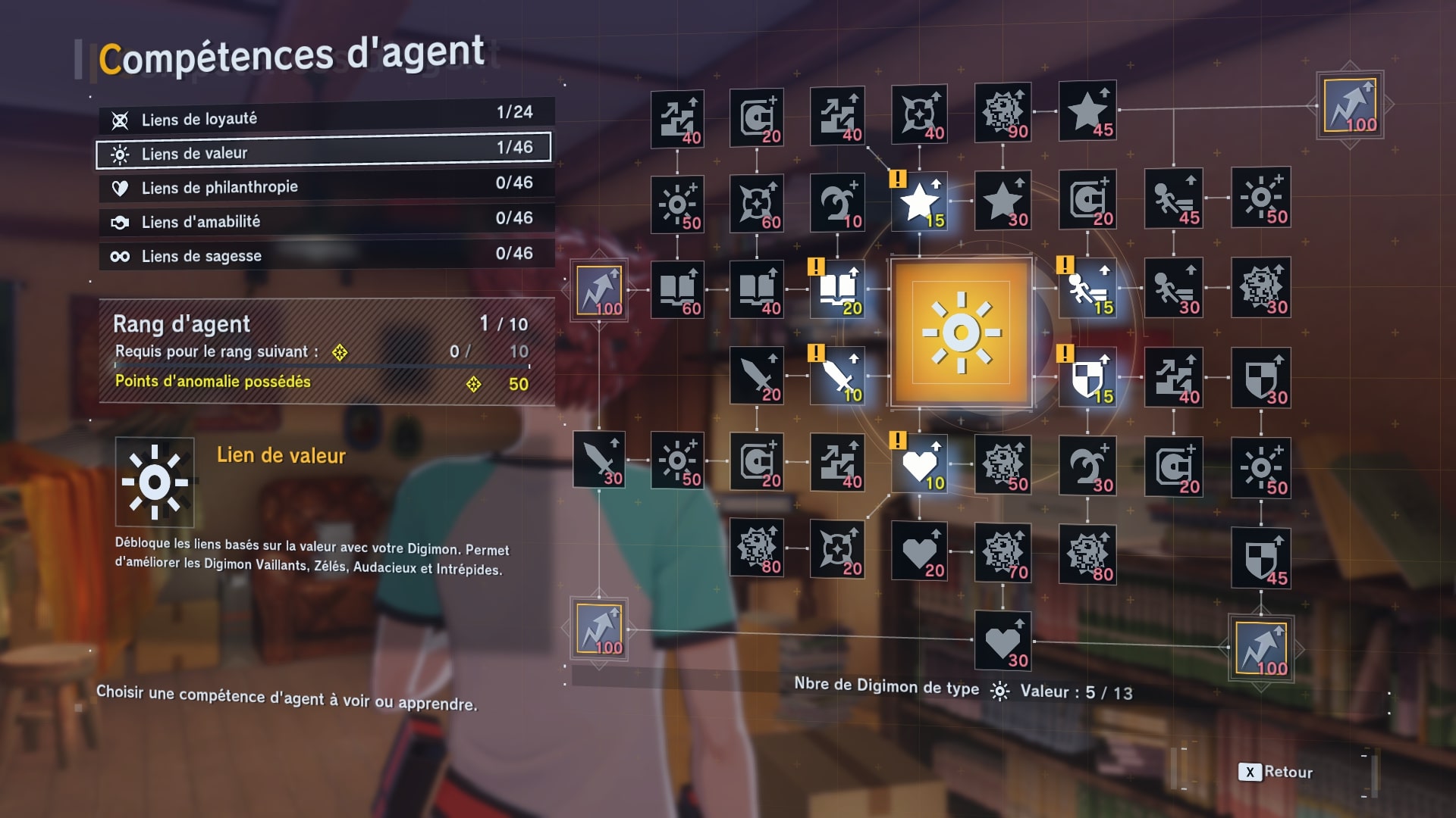 Bien entendu, les envoyer au combat et utiliser ou leur confier des objets ne sont pas les seuls moyens de renforcer leurs aptitudes en vue de procéder à leur digivolution. La Digiferme, un lieu personnalisable depuis la réception du Cinéma de l’Entremonde, est aussi conçu pour ça, tout comme les arbres de compétences de notre protagoniste. Au nombre de cinq, y dépenser dedans les points d’Anomalie récupérés en terminant des quêtes principales et secondaires nous aide à débloquer pléthore de bonus passifs permanents et augmenter notre niveau d’Agent ou Agente.