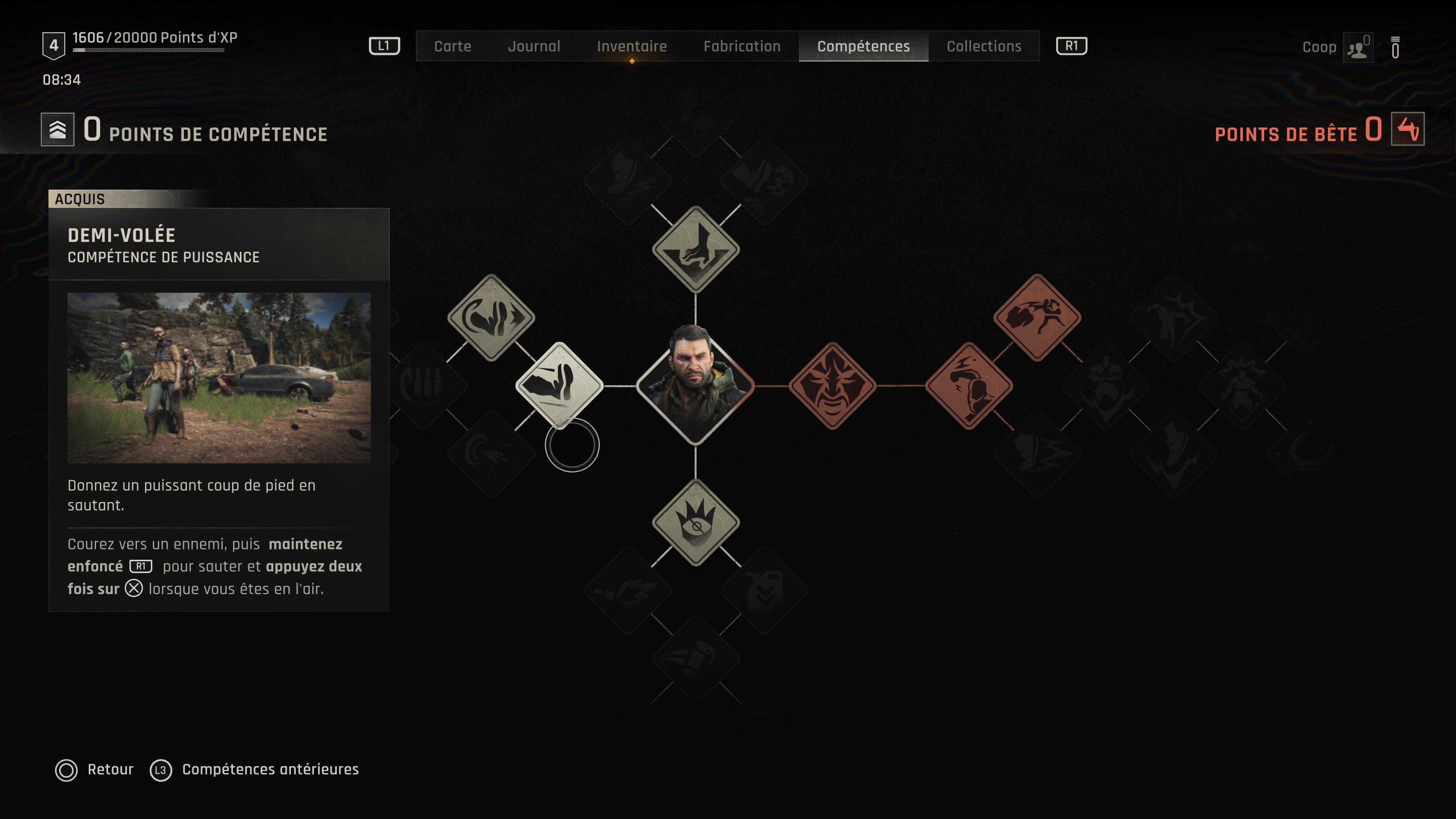 En plus de l’arbre de compétences dédié à sa partie bestiale, Kyle dispose aussi de trois autres arbres axés autour du combat, de la survie et du parkour. Les points de compétences s’obtiennent naturellement en montant de niveau et nous permettent ainsi de bénéficier d’une montée en puissance de notre personnage.