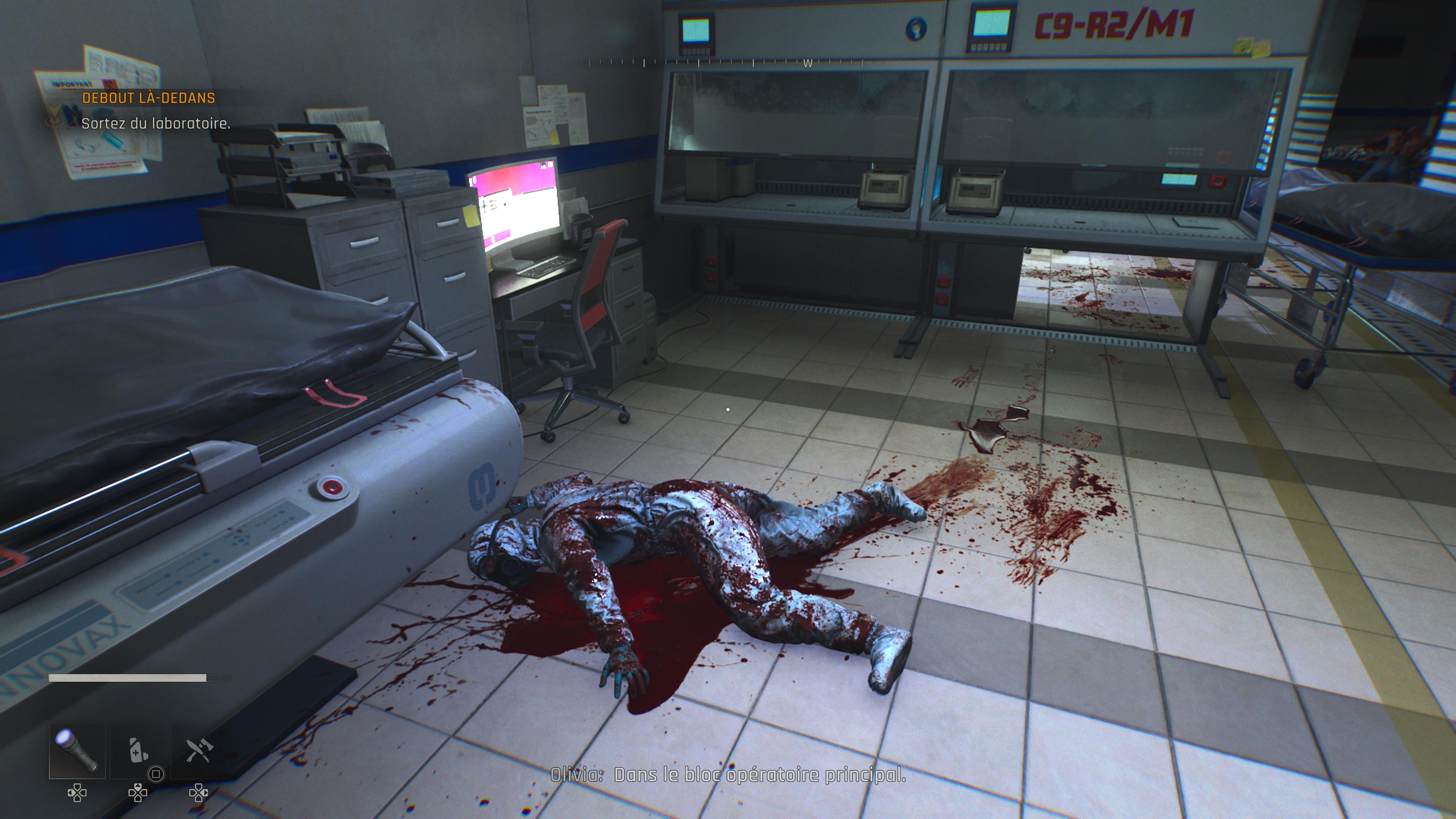 Alors qu’il ne semblait plus avoir d’espoir ou de volonté de vivre, un autre cobaye du Baron parvient à se libérer de ses bourreaux et semer le chaos dans le centre de recherches. L’occasion pour notre héros de profiter de l’opportunité pour prendre la tangente également, guidé par une mystérieuse femme, Olivia, via le talkie-walkie d’un garde ayant eu le malheur de s’opposer à la créature échappée.