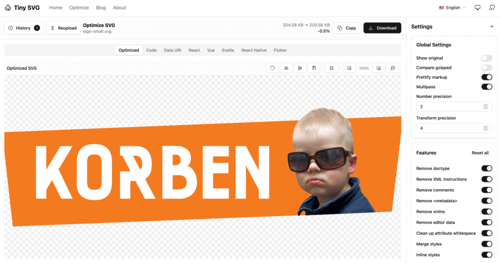 J’ai testé sur mon logo mais comme il est déjà super optimisé, ça ne m’a fait gagné que -0,5 % mais les résultats sont plutôt impressionnants car sur certains fichiers, Tiny SVG peut réduire la taille jusqu’à 70%. Ça dépend évidemment de la complexité du SVG d’origine et des optimisations que vous activez, mais globalement c’est très efficace.