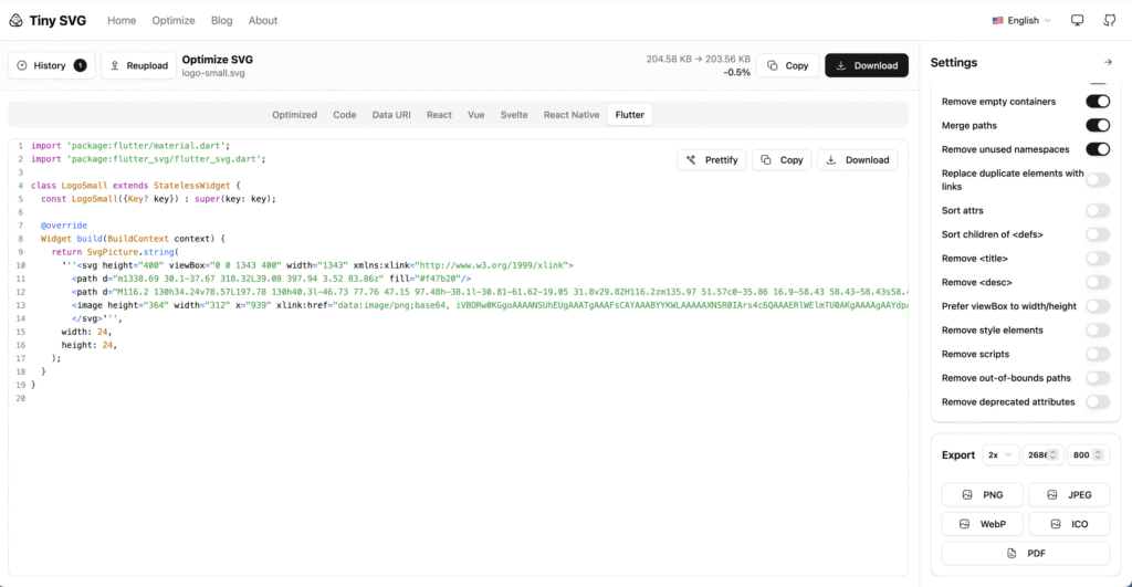 Et y’a pas que la compression puisque Tiny SVG génère aussi du code prêt à l’emploi pour vos frameworks préférés. Vous pouvez ainsi exporter votre SVG optimisé en composant React (JSX ou TSX), Vue, Svelte, React Native ou même Flutter. Trop pratique pour ne plus avoir besoin de convertir manuellement vos icônes en composants.