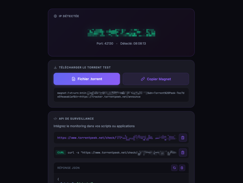 Le truc cool avec cet outil, c’est qu’il propose aussi une API JSON pour ceux qui aiment bien automatiser leurs tests ou surveiller leur connexion via un petit script maison. Il suffit de faire un petit curl sur l’URL fournie pour obtenir le statut de votre connexion à l’instant T.