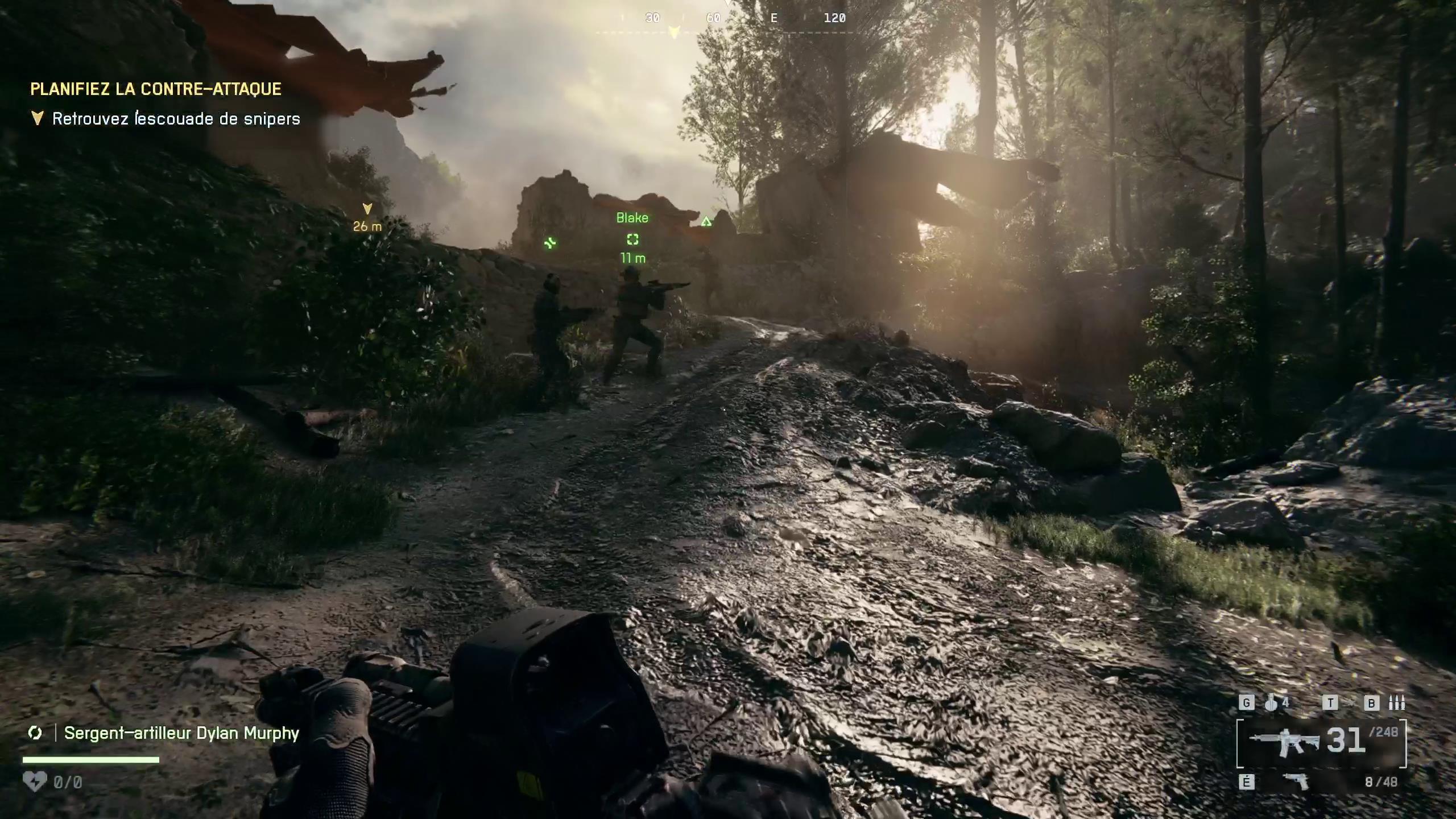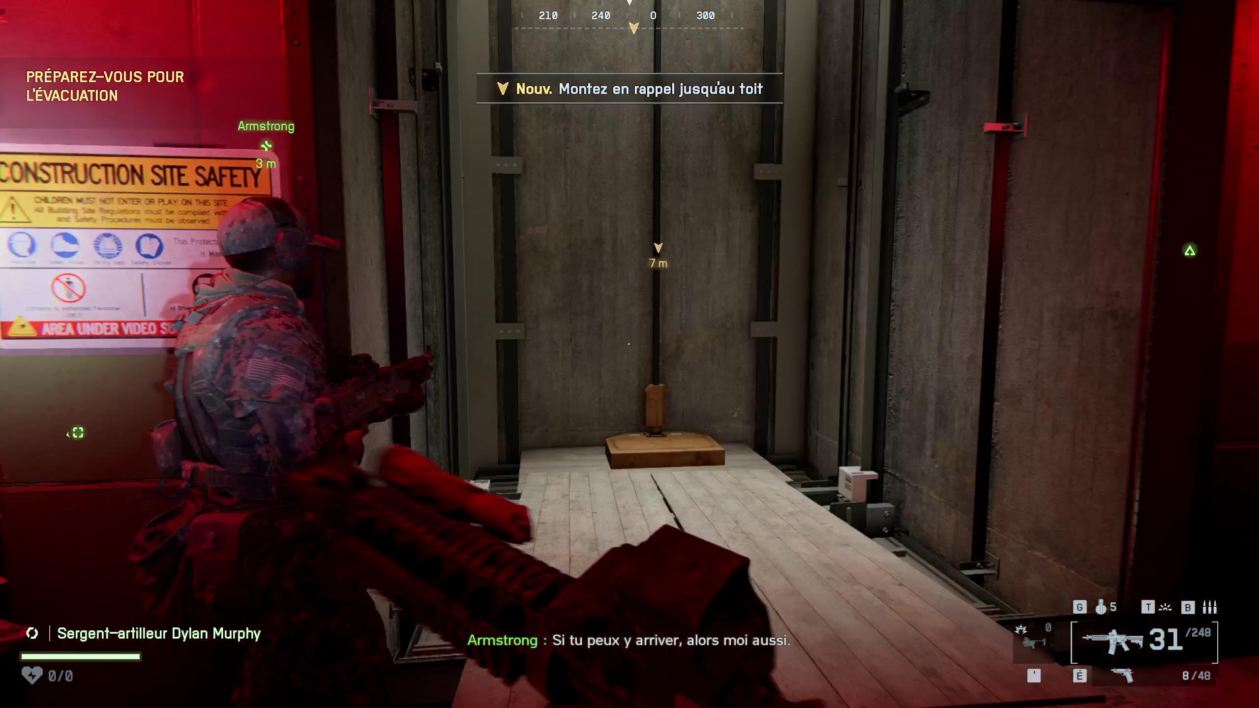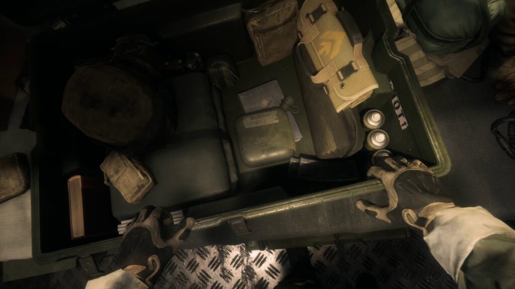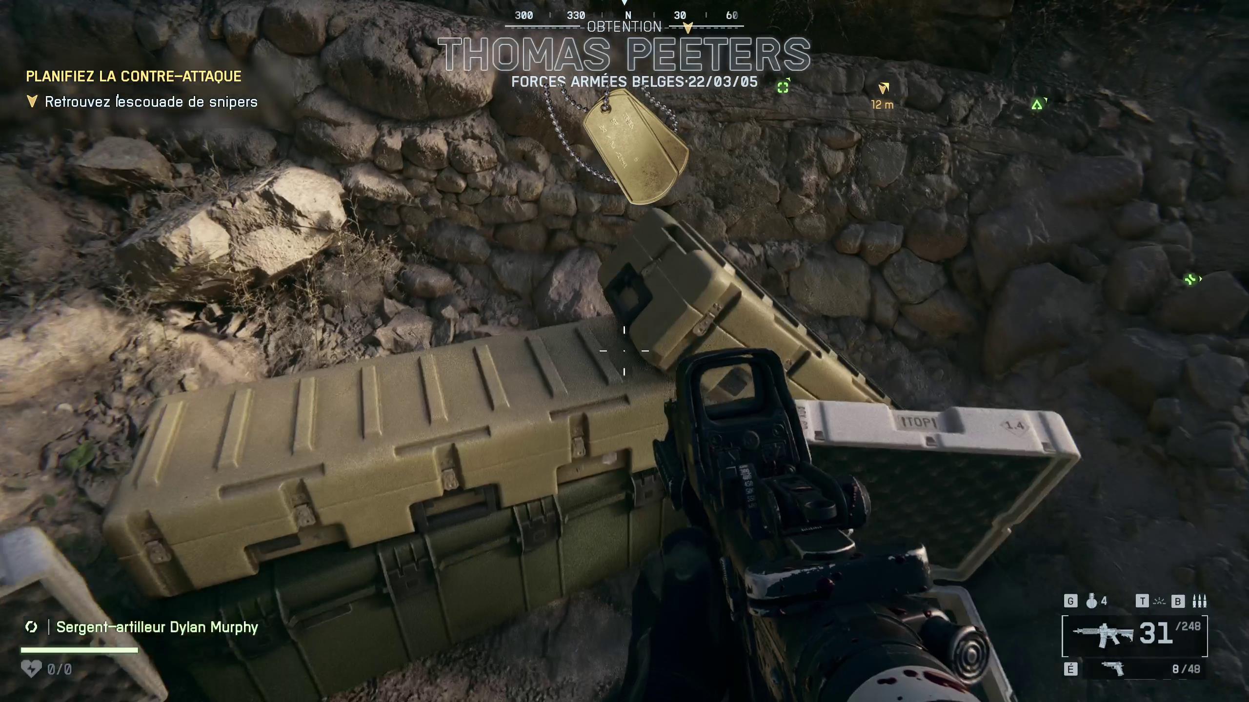- Le premier se trouve à gauche des escaliers, sur une caisse, juste après être descendu de la voiture et avant de rejoindre les autres soldats (le moment où vous marquez les cibles avec les jumelles)
