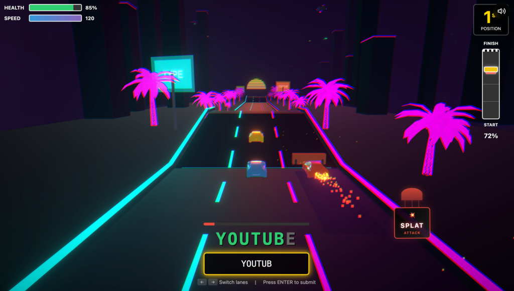 TypeToRace, c’est un jeu de course 3D gratuit qui tourne directement dans votre navigateur et où votre vitesse dépend de votre capacité à taper des mots rapidement. Plus vous tapez vite, plus votre voiture accélère et vous vous retrouvez donc à foncer sur une route synthwave avec des néons roses et bleus partout pendant que vous tentez de taper “algorithm” sans faire de faute (oui c’est en anglais).