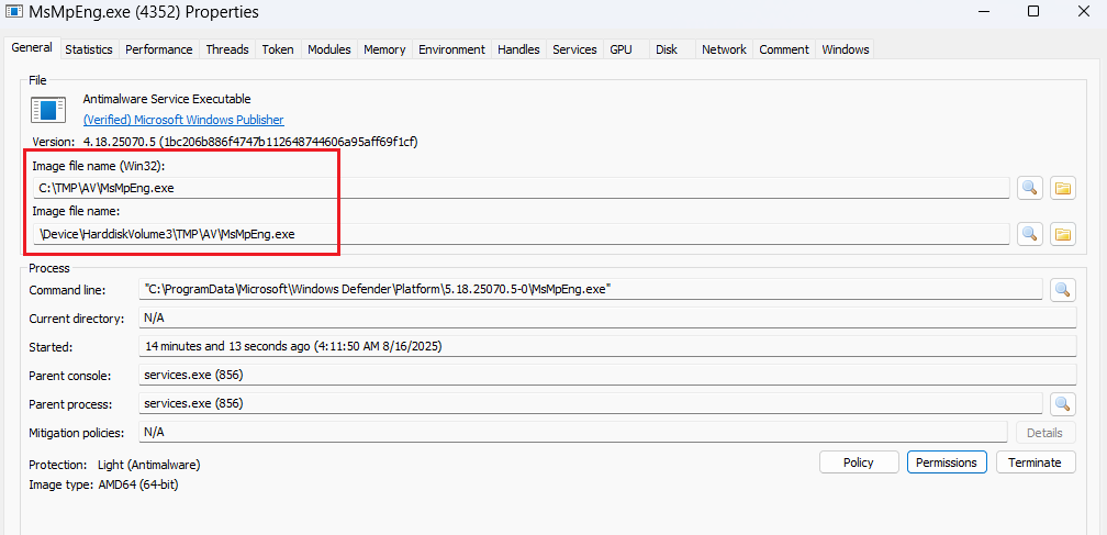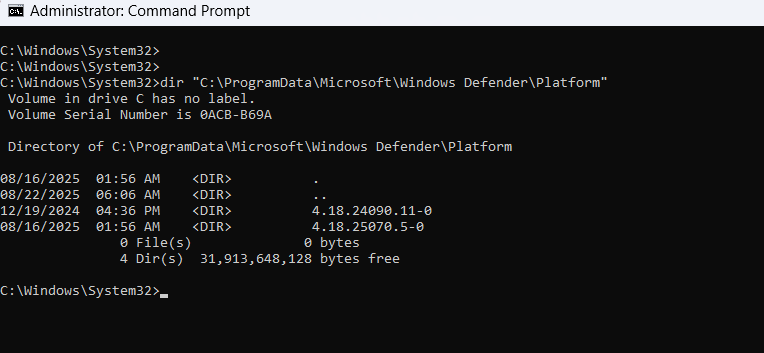 L’astuce ici, c’est que l’attaque joue avec la manière dont Windows Defender gère ses propres mises à jour. Je vous explique… Vous voyez ce dossier C:ProgramDataMicrosoftWindows DefenderPlatform où l’antivirus range ses exécutables ? Eh bien, chaque mise à jour génère un nouveau sous-dossier avec un numéro de version, genre 4.18.24090.11-0. Et au démarrage, Defender se lance à la recherche de la version la plus fraîche pour s’exécuter.