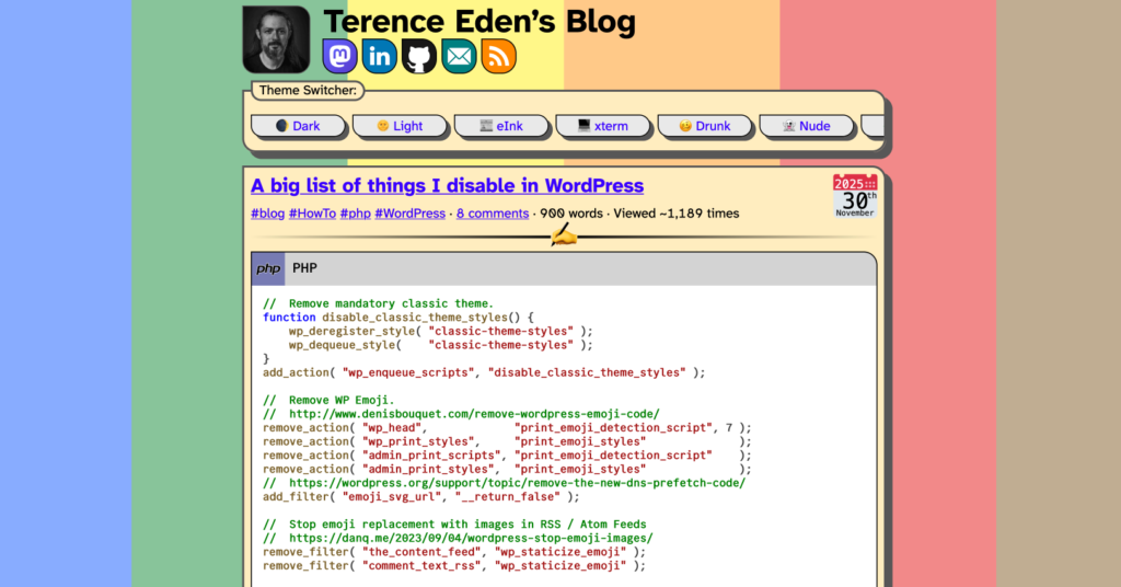 Par exemple les emojis. J’sais pas si vous savez, mais WordPress charge un script de détection d’emojis et une feuille de style dédiée sur CHAQUE page de votre site. Pourquoi tant de haine ? Hé bien parce que si vous tapez 🙂 dans un article, WordPress veut le transformer en joli emoji. Sauf que si vous utilisez les vrais emojis Unicode (comme tout le monde en 2025), hé ce script ne sert à rien. Et il y a aussi le grand remplacement des emojis dans les flux RSS…. Bref, tout ça, ça dégage.