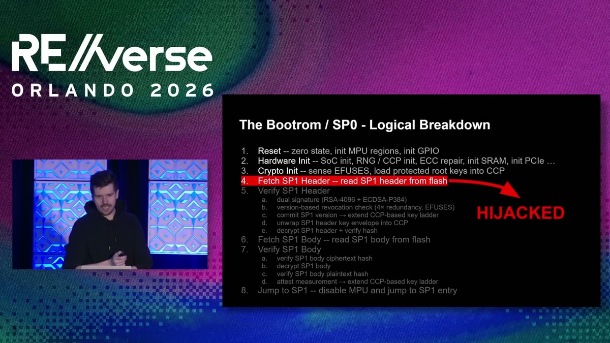 Le boot flow du PSP. Le hijack se produit à l’étape 4, avant toute vérification crypto.