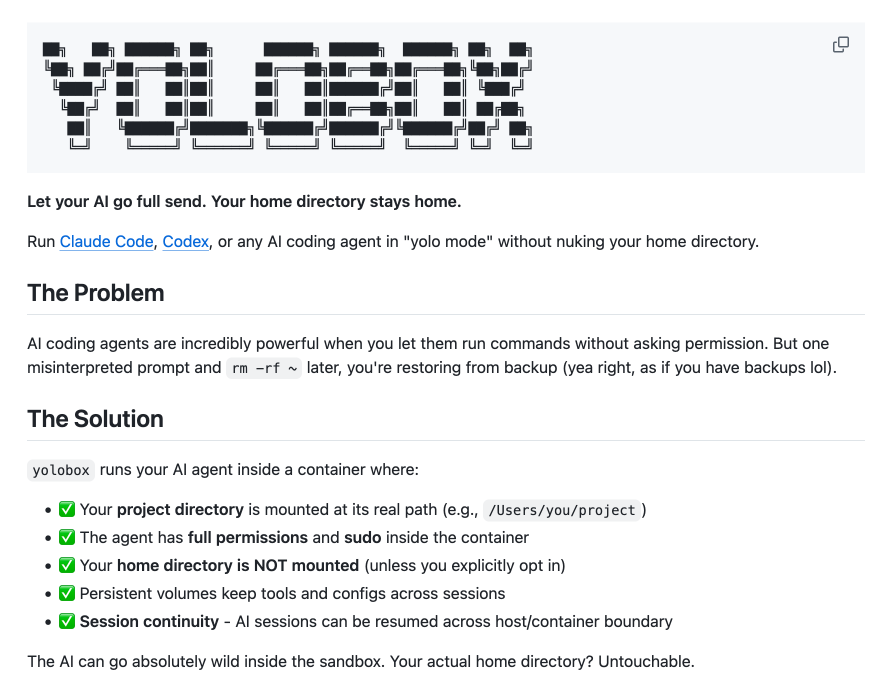 En fait avec Yolobox, seul votre dossier projet est monté en lecture-écriture avec le même chemin que sur votre machine et comme ça, l’agent bosse comme si de rien n’était. Sauf que tout le reste (vos clés SSH, vos credentials, vos photos de vacances à la plage naturiste et j’en passe…) est inaccessible depuis le conteneur. L’agent peut faire sudo, installer ce qu’il veut, déglinguer sa config… en fait RIEN ne s’échappe.